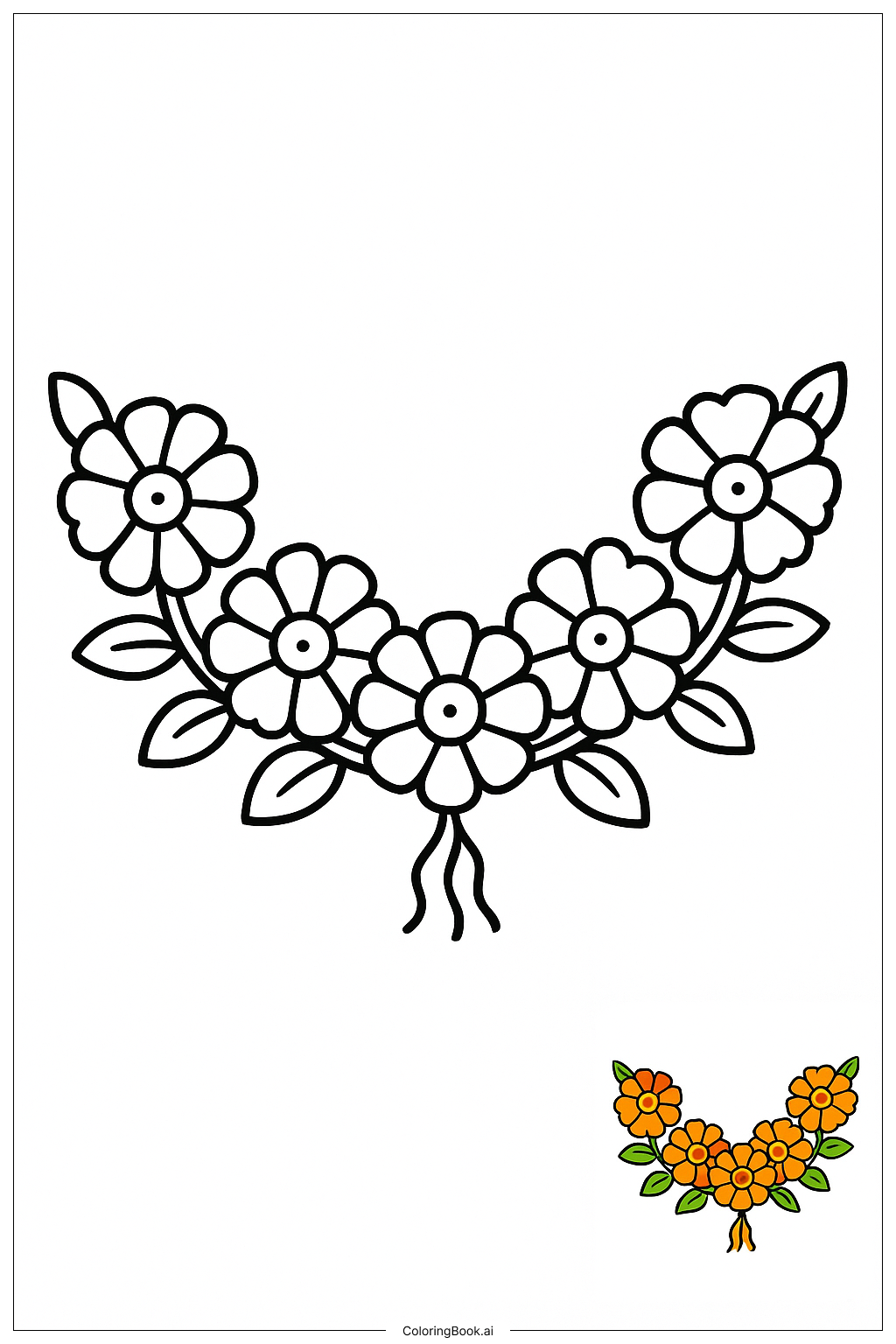 为这个墨西哥金盏菊花环上色时,可以使用明亮的橙色和黄色来呈现花朵。这些颜色代表了快乐和庆祝。可以自由地混合浅色和深色以创建深度。对于叶子,可以使用不同深浅的绿色,如浅绿色和深绿色,以增加变化。上色后,还可以用细黑笔勾勒花朵和叶子的轮廓,使其更加突出。不要忘了加上与您的花环相辅相成的色彩背景,比如阳光明媚的天空或者节日设计。